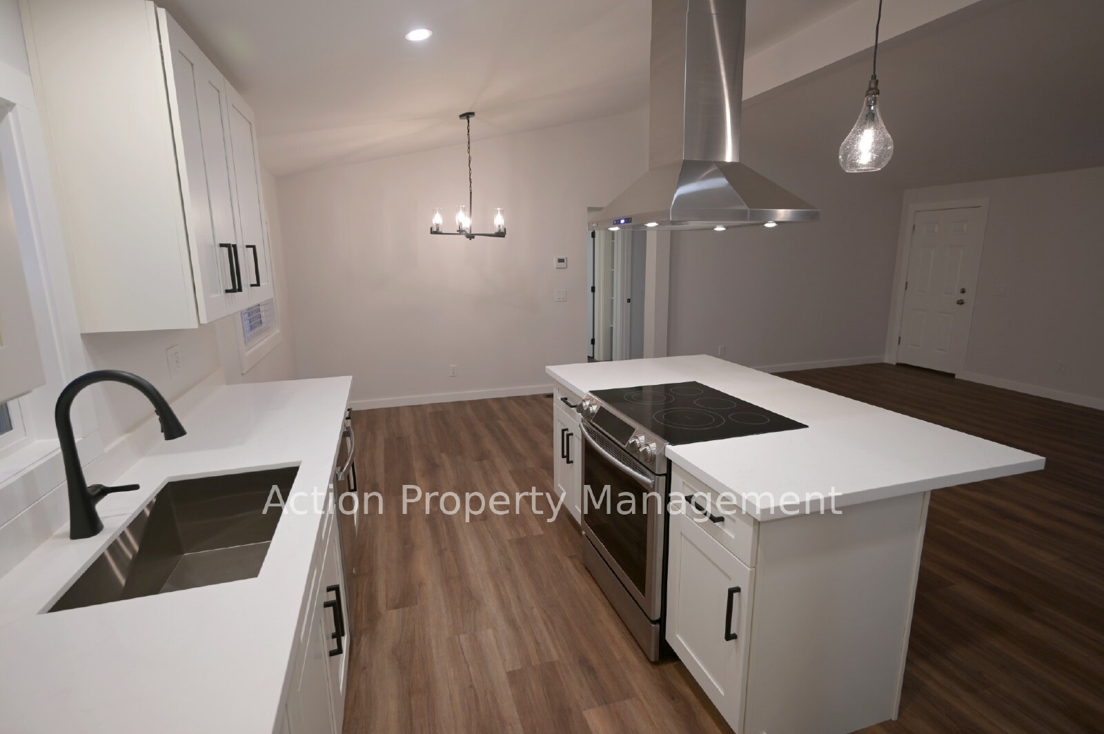 Modern kitchen with all-new stainless steel appliances and glass cooktop